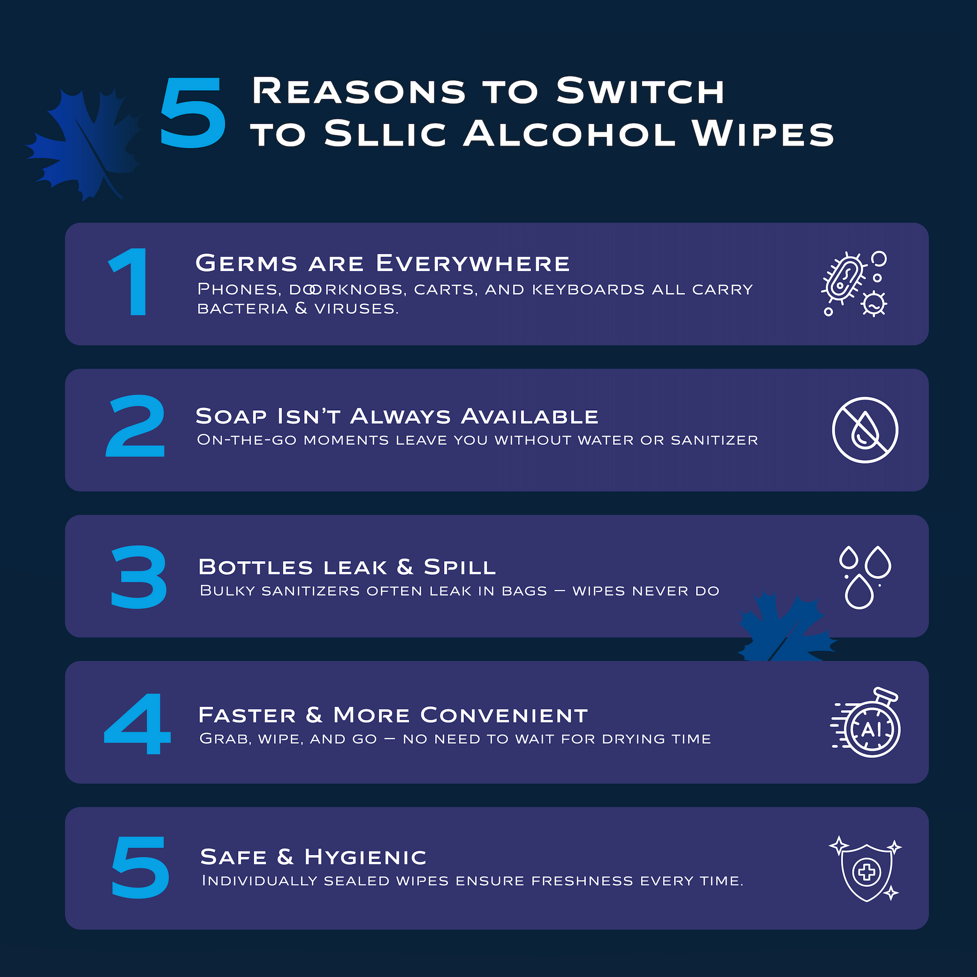 DISINFECTANT WIPES - Keep your hands and surfaces clean with SLLIC Disinfectant Wet Wipes. These premium wet wipes are infused with 75% alcohol, and are designed to keep your spaces clean and your hands safe.